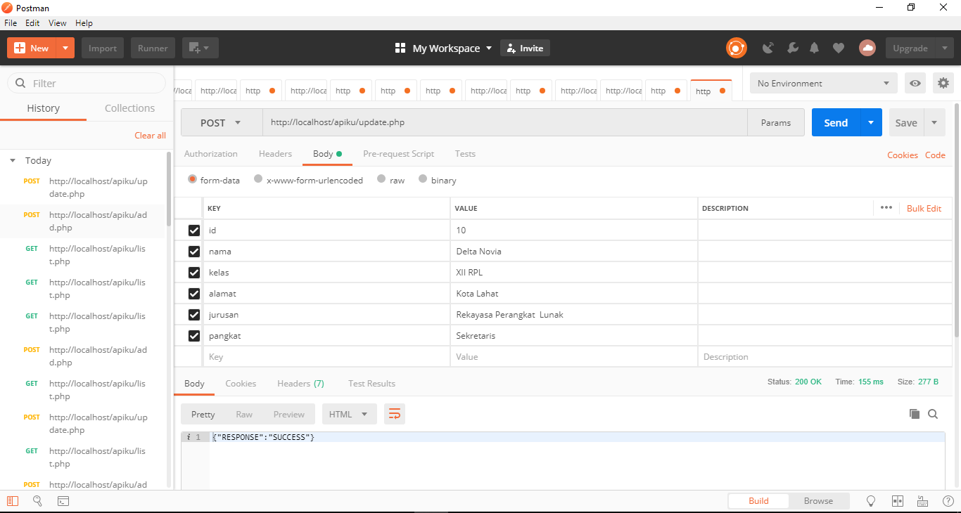 ?>Setelah semua file diatas dibuat, jangan lupa untuk di save dan ditest. Disini kita akan menggunakan aplikasi Postman untuk pengecekan api yang kita buat diatas berjalan dengan baik atau tidak.